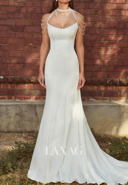 Scoop-Neck Beaded-Straps Mermaid Wedding Dress Sweep Train Satin Bride Gowns with Tulle Gloves