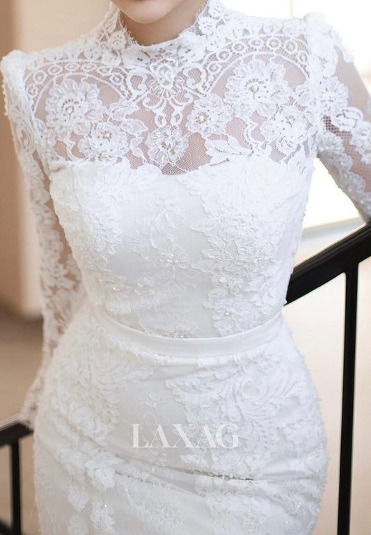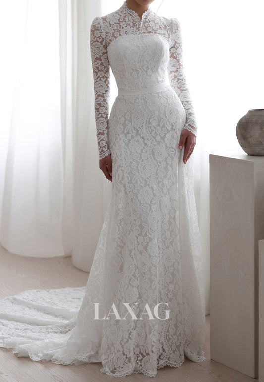 Allover Lace Applique Sheer Bride Gowns High-Neck Long-Sleeves Mermaid Wedding Dress with Train