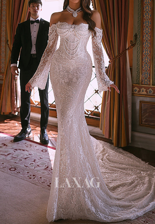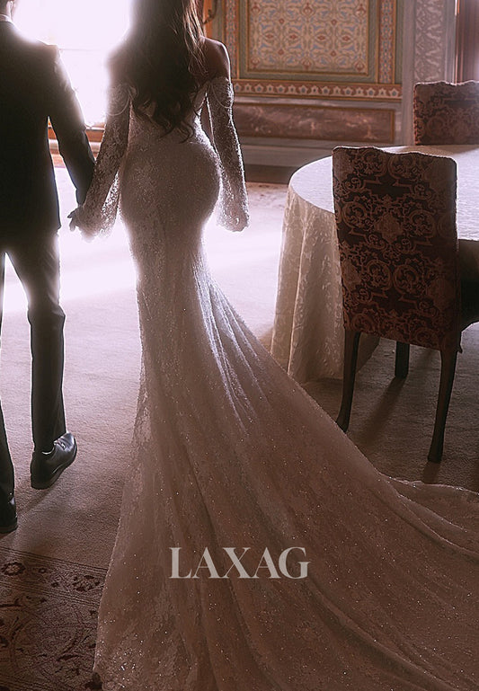 Sweetheart Off-Shoulder Long-Sleeves Beaded Allover Lace Applique A-Line Wedding Dress with Train
