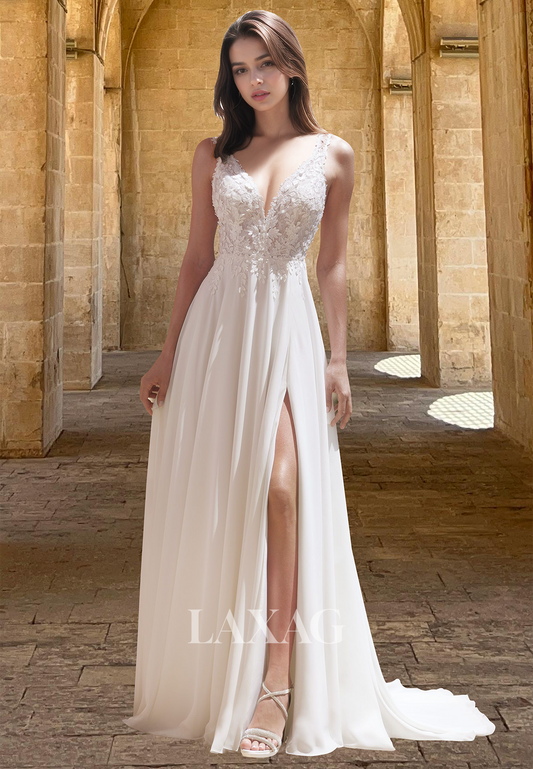 Sleeveless Straps A-Line Beach Wedding Dress Deep V-Neck Beaded Applique Cutout Boho Bride Gowns with Train