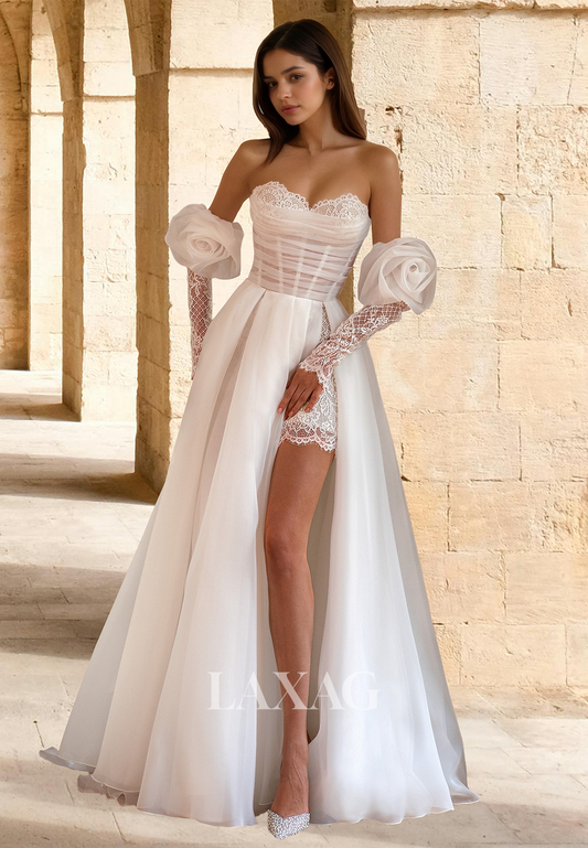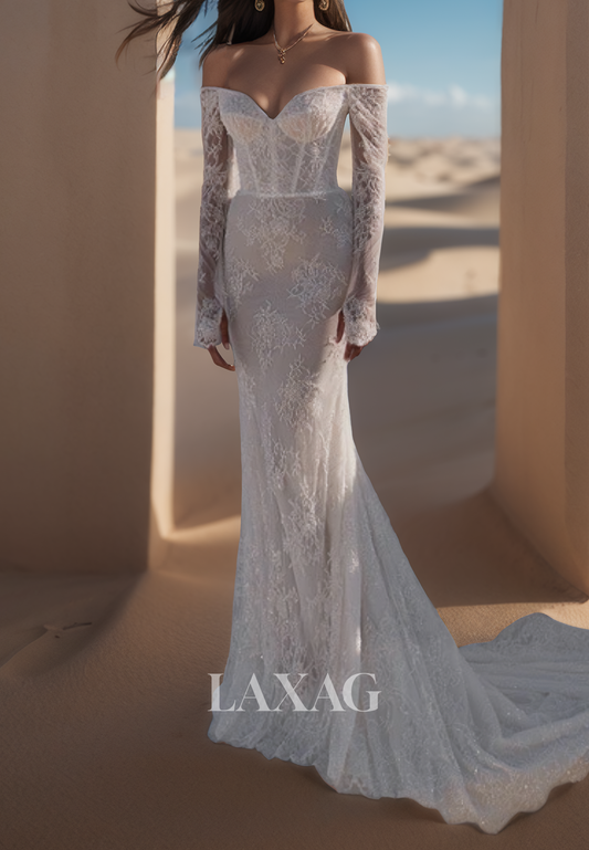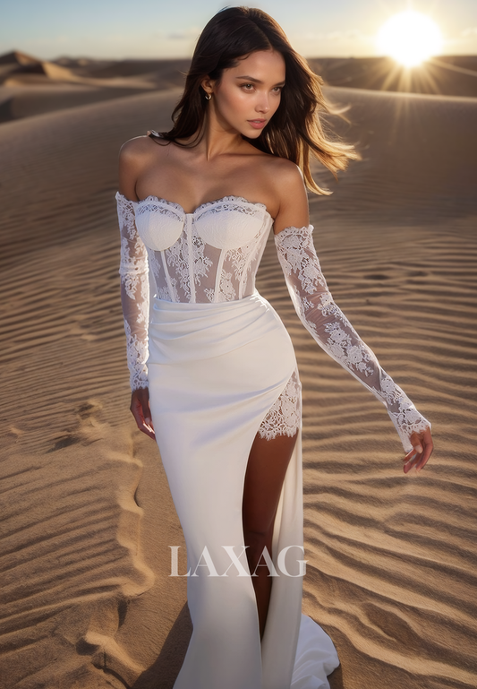 Lace Long Sleeves Sweetheart Pleated A-Line Wedding Dress Off-Shoulder High Slit Bride Gowns with Train