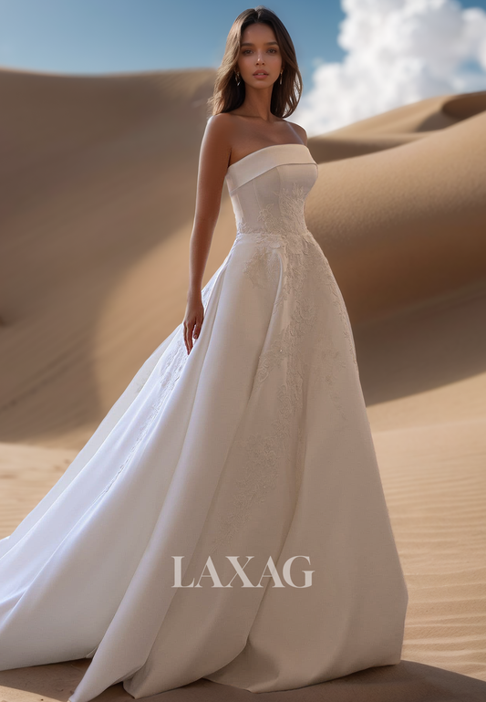 Tube Top Off-Shoulder Sleeveless Satin A-Line Boho Beach Wedding Dress with Floral Embellished