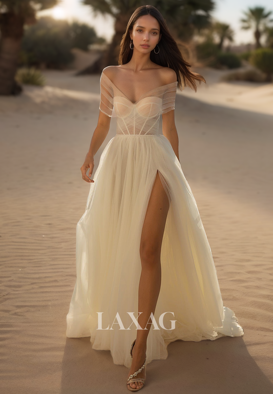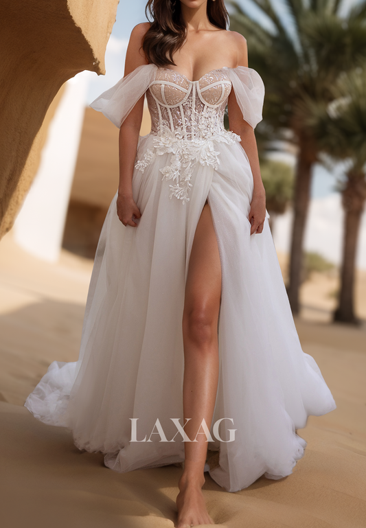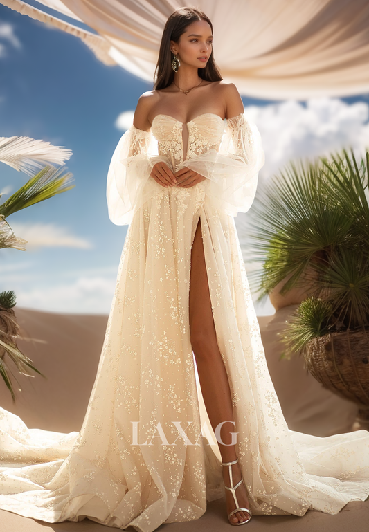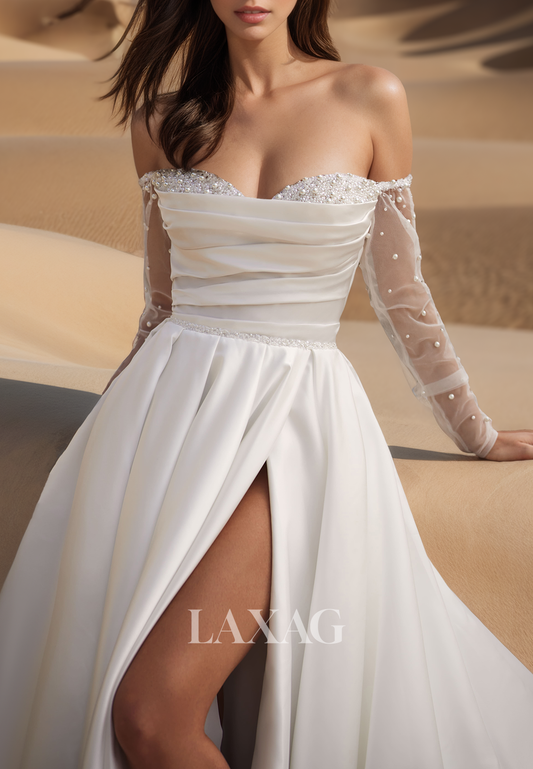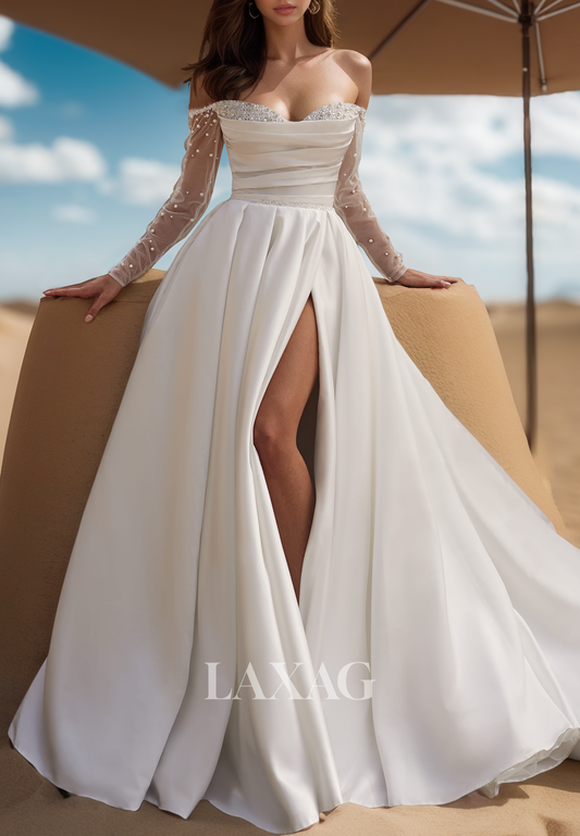 A-Line Sweetheart Sleeveless Wedding Dress Off-Shoulder Beaded Train High Slit Bride Dress