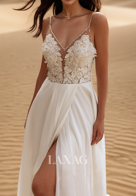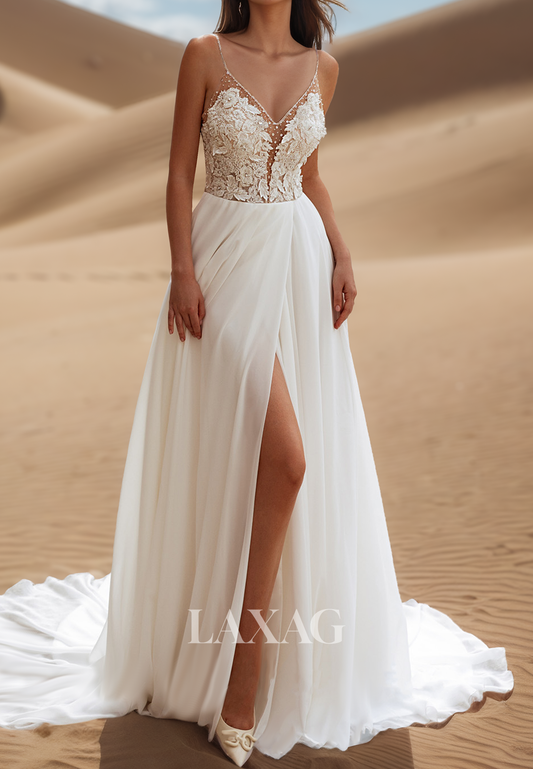 Spaghetti Straps Deep V-Neck A-Line Wedding Dress Glitter-Knit Beaded Train Bride Dress with High Slit