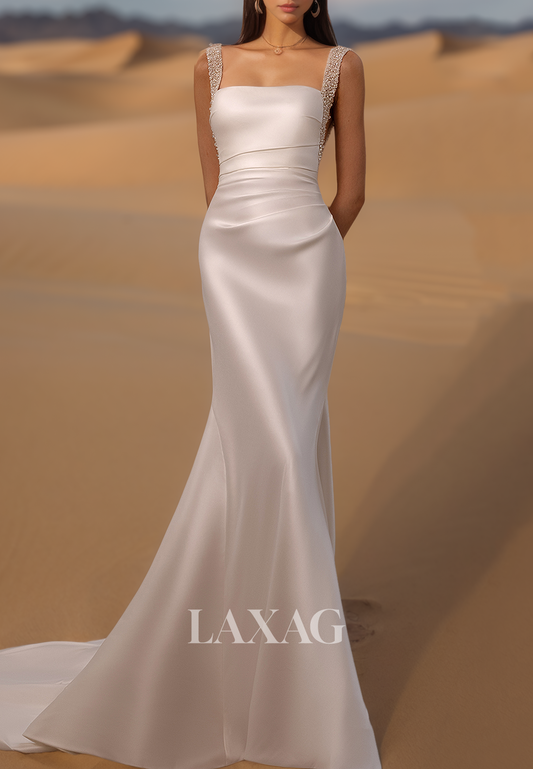 Square-Neck Straps Sleeveless A-Line Wedding Dress Off-Shoulder Pleated Satin Train Bride Gowns