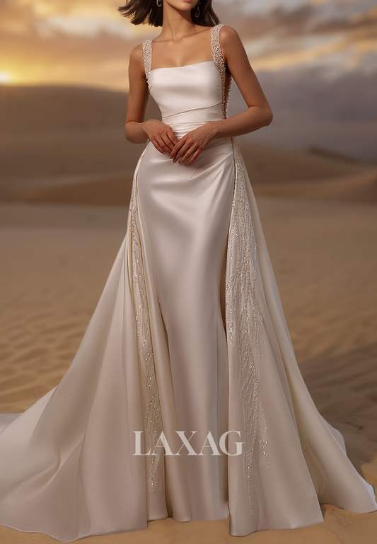 Beaded V-Neck Sleeveless Mermaid Bride Gowns Straps Satin Train Wedding Dress with Overskirt