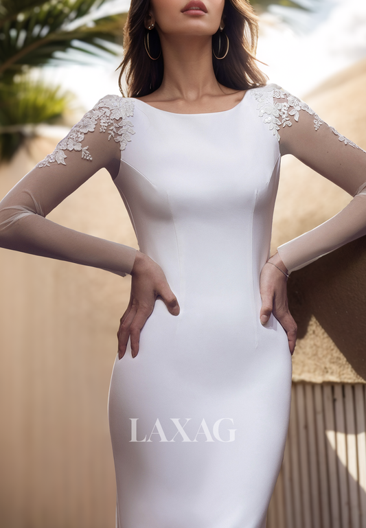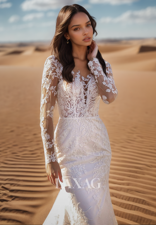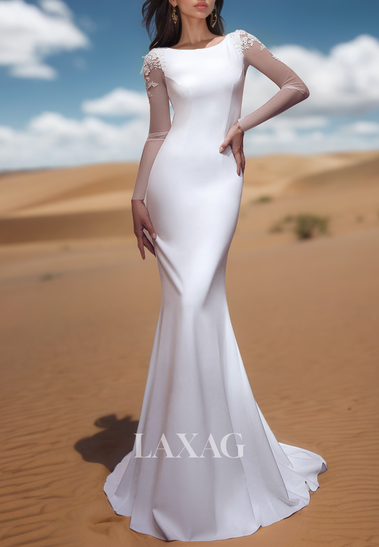 Sweetheart Beaded Mermaid Wedding Dress Long-Sleeves Applique Bride Gowns with Sweep Train