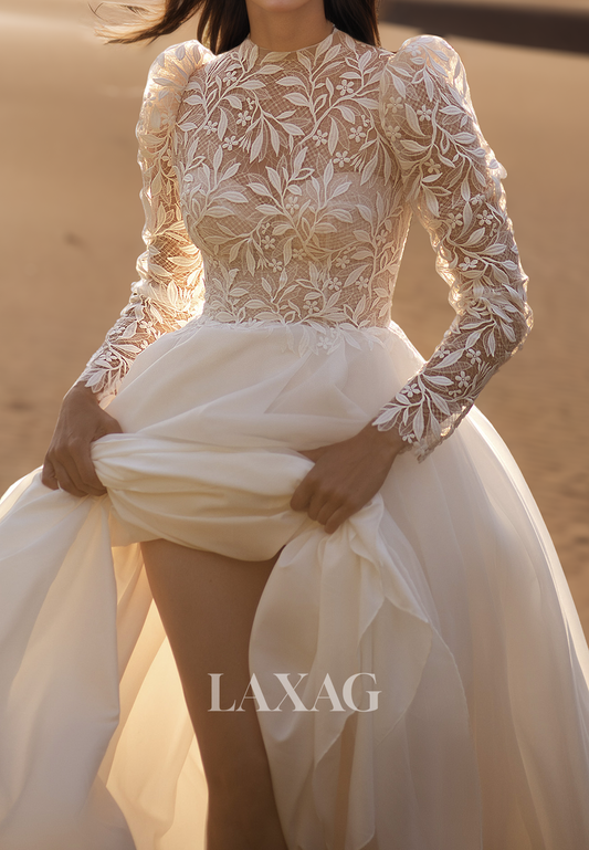 Deep V-Neck Tulle Long-Sleeves A-Line Bride Gowns Beaded and Lace Applique Wedding Dress