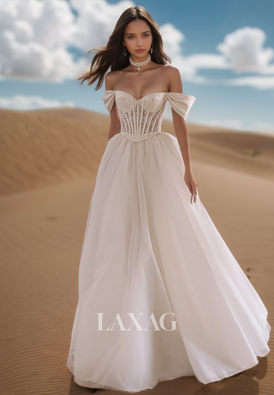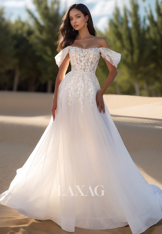 Allover Lace Applique Sweetheart Sleeveless Bride Dress Off-Shoulder Cutout A-Line Wedding Dress with Train