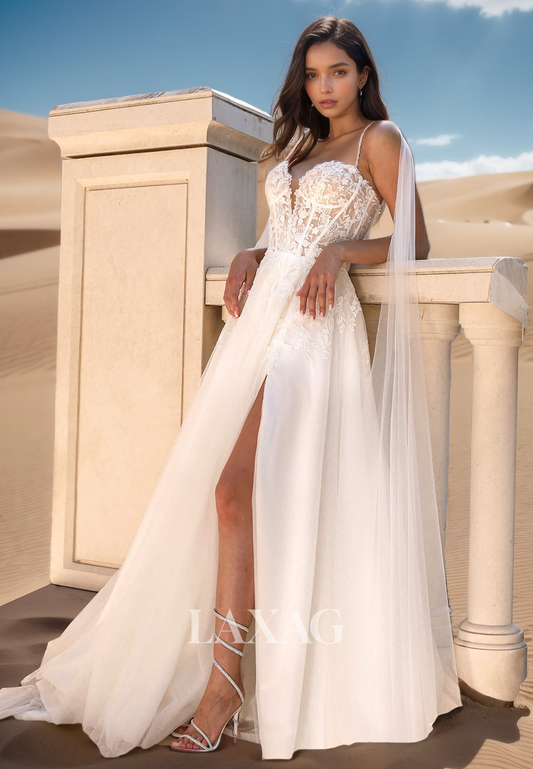 Sweetheart Spaghetti Straps A-Line Wedding Dress Applique Sheer High Slit Tulle Brided Gowns