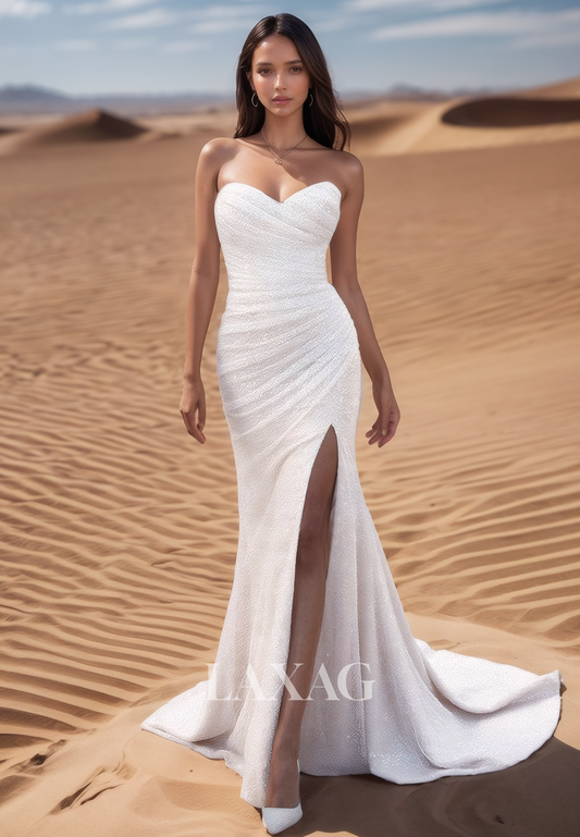 Sweetheart Sleeveless Off-Shoulder Pleated A-line Bride Dress Glitter-Knit High Slit Wedding Dress with Train
