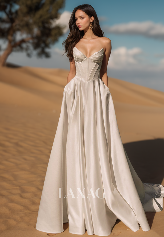 Tube Top Sleeveless Off-Shoulder Pleated High Slit Satin A-Line Wedding Dress with Train