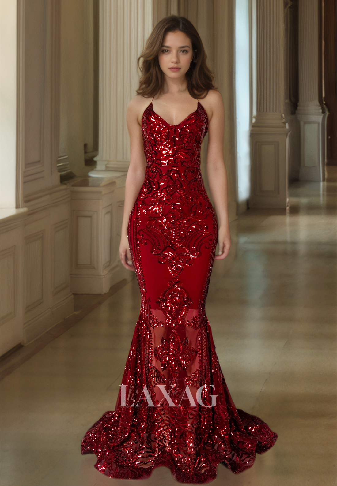 Off-Sholder V-Neck Sequined Lace Evening Gowns Spaghetti Straps Sheer Mermaid Prom Dress