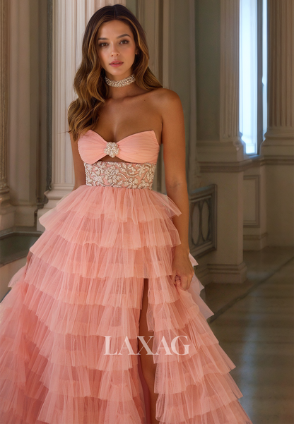 Off-Shoulder Sweetheart Sleeveless Evening Gowns Beaded Tiered High Slit Tulle A-Line Prom Dress