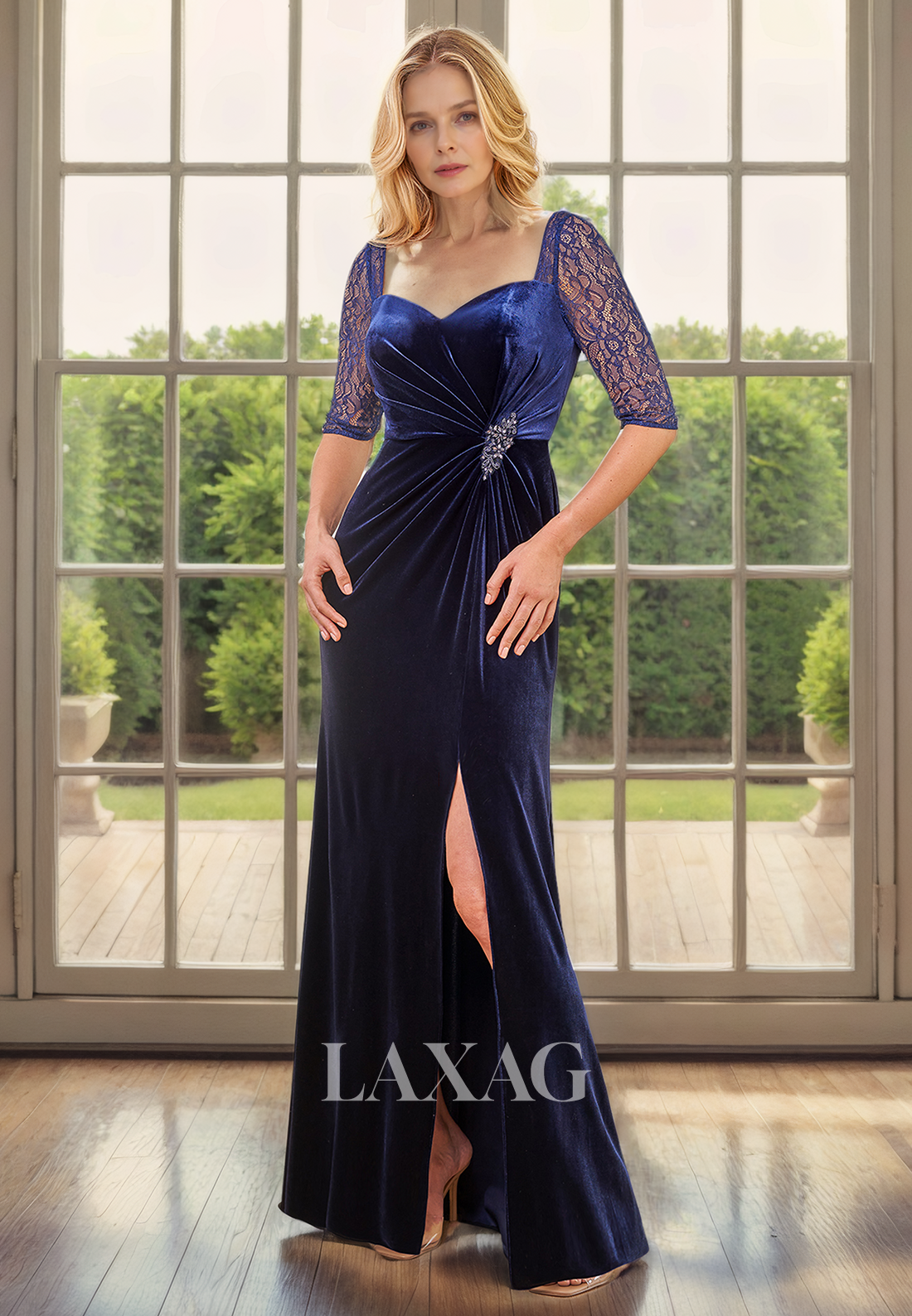 Sweetheart Half Sleeves Lace Beaded Mother of the Bride Dress with Slit