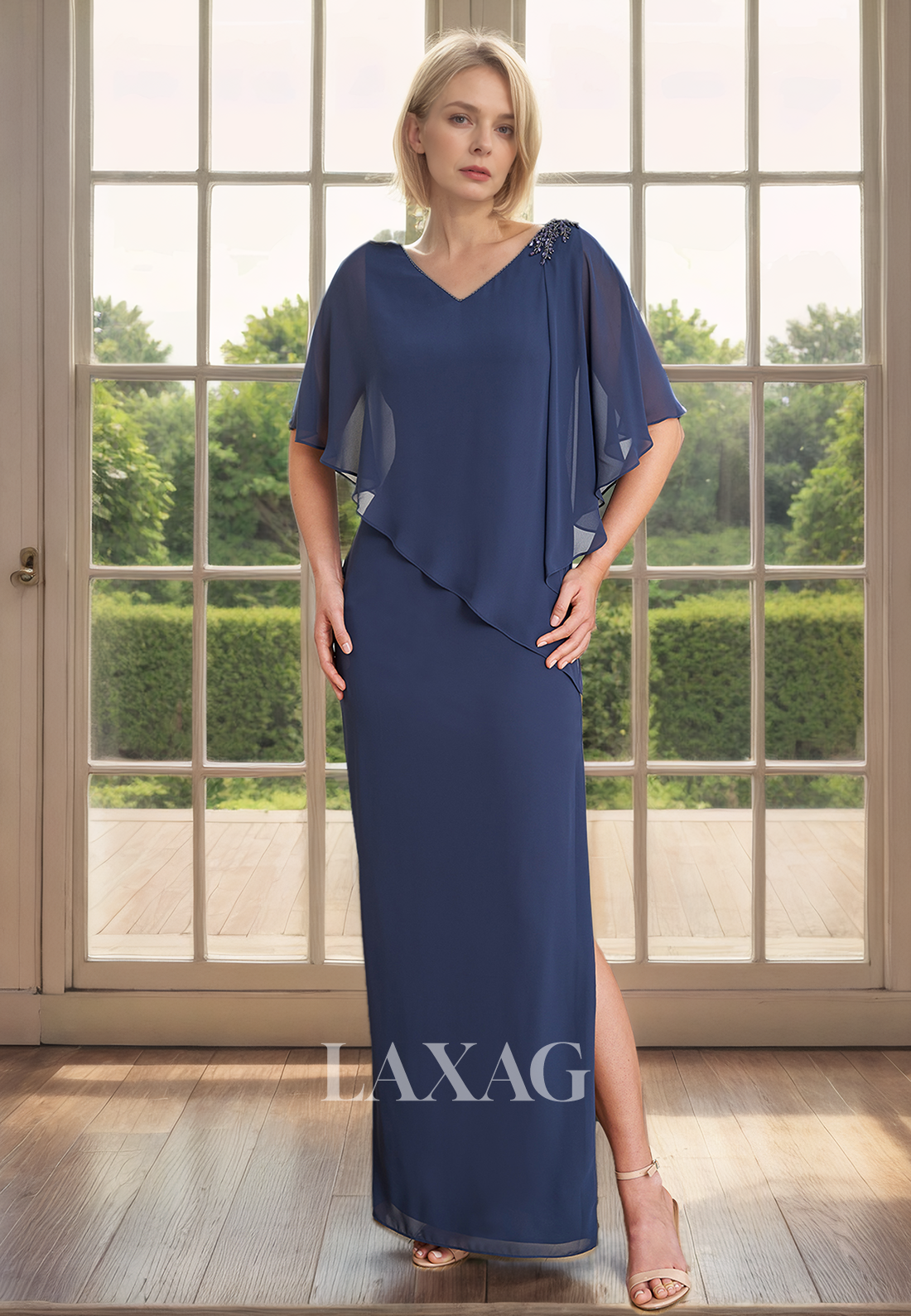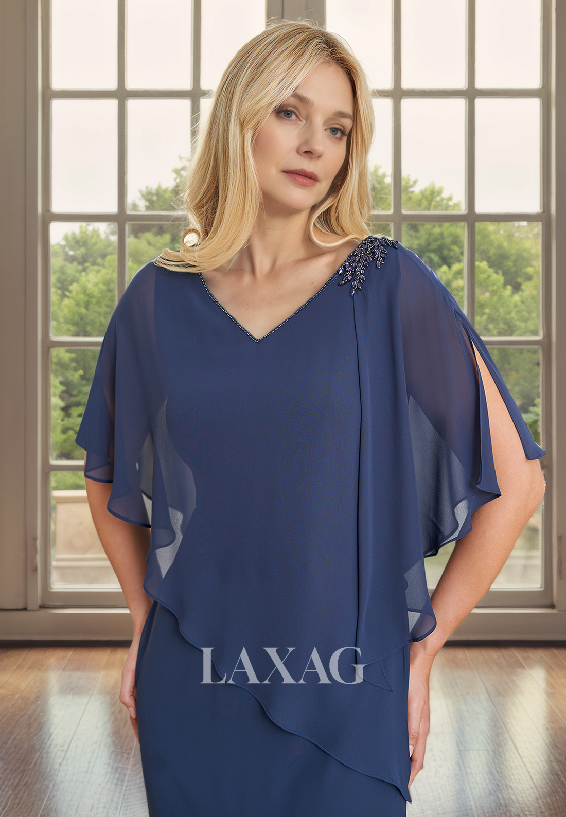 Elevate the elegance of your special occasion with our A-Line V-Neck Half Sleeves Beaded Chiffon Mother of the Bride Dress. Crafted from luxurious chiffon fabric, this dress features delicate beaded detailing and a flattering A-line silhouette. Perfect for any mother of the bride, this dress exudes sophistication and style.