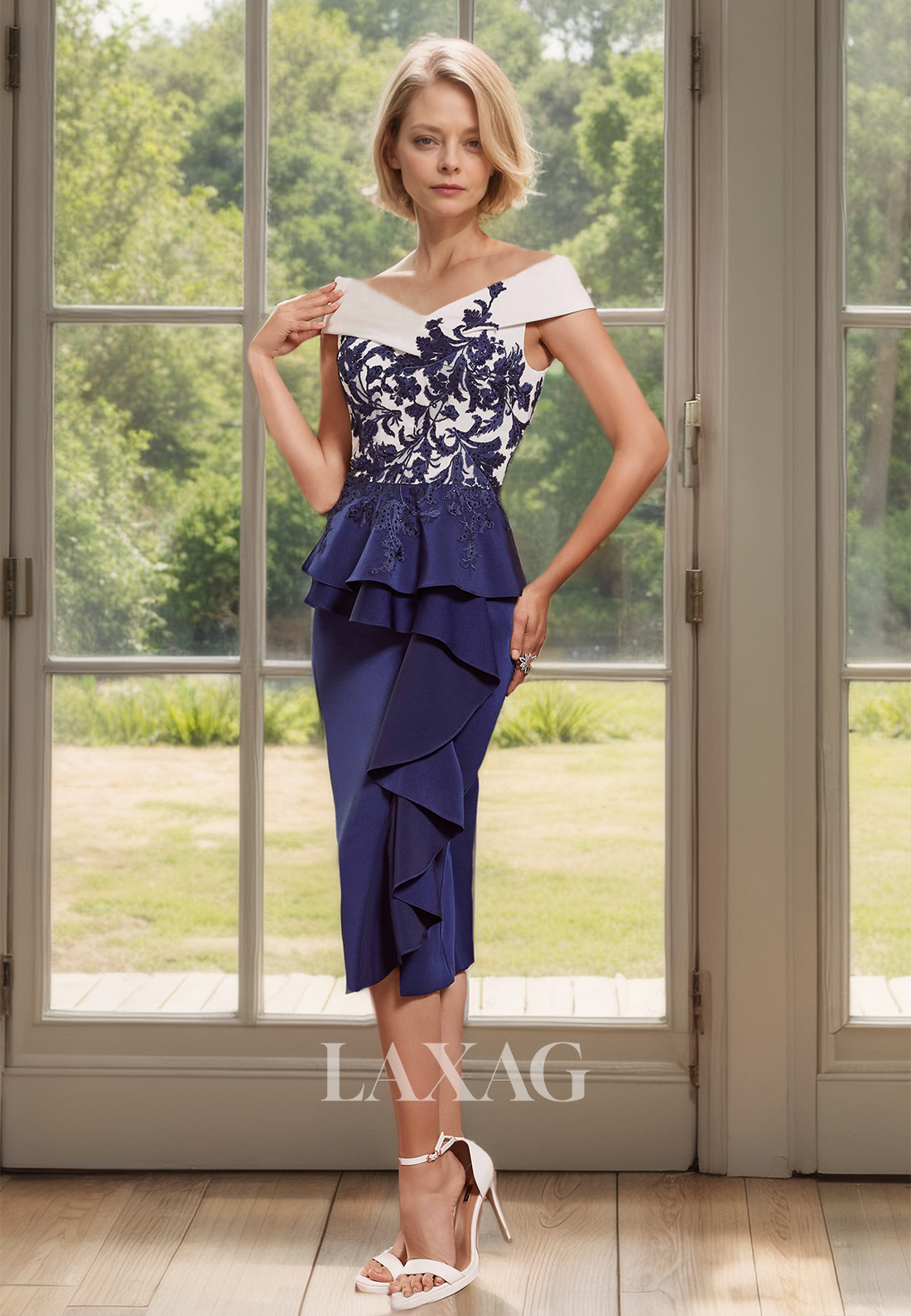 Expertly crafted for the mother of the bride, this stunning cocktail dress features a sleeveless V-neckline and a two tone tiered design. The intricate beaded applique adds a touch of elegance, while the midi mermaid silhouette flatters the figure. Perfect for any special occasion, this gown is sure to impress.