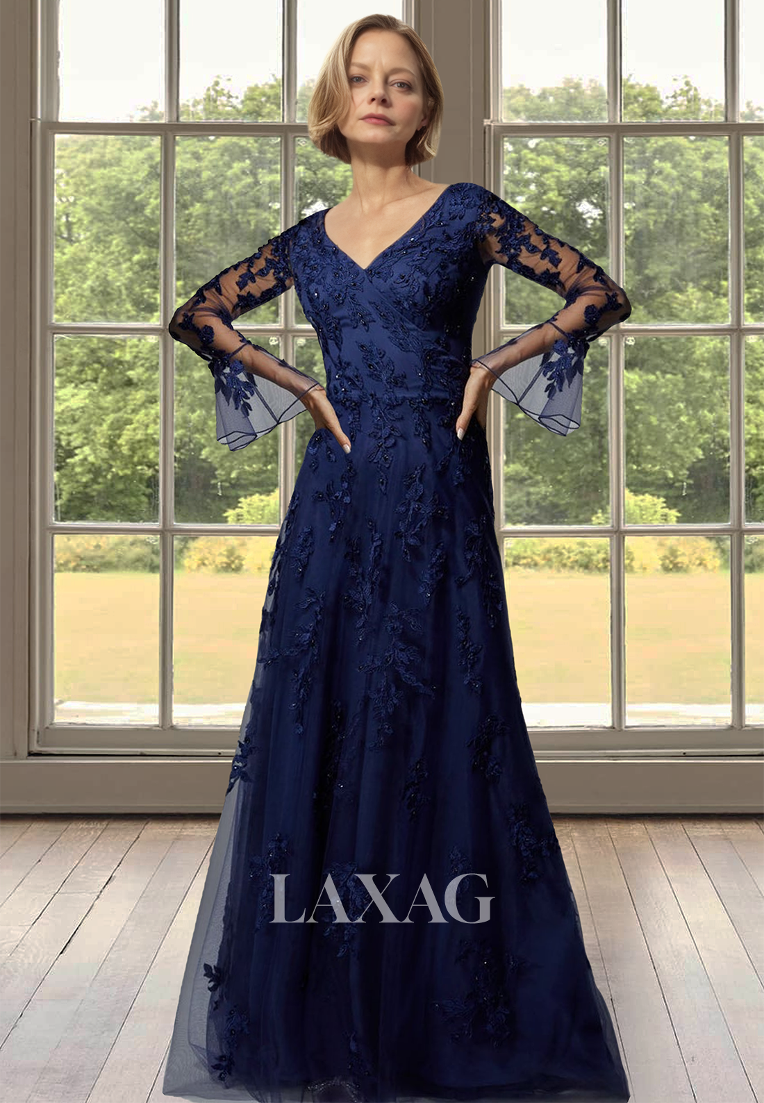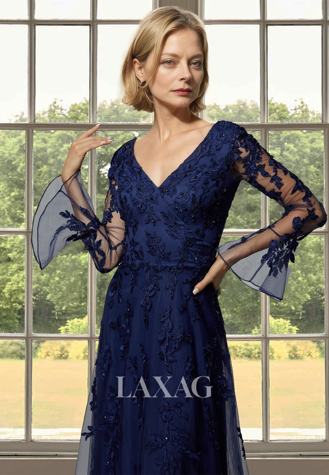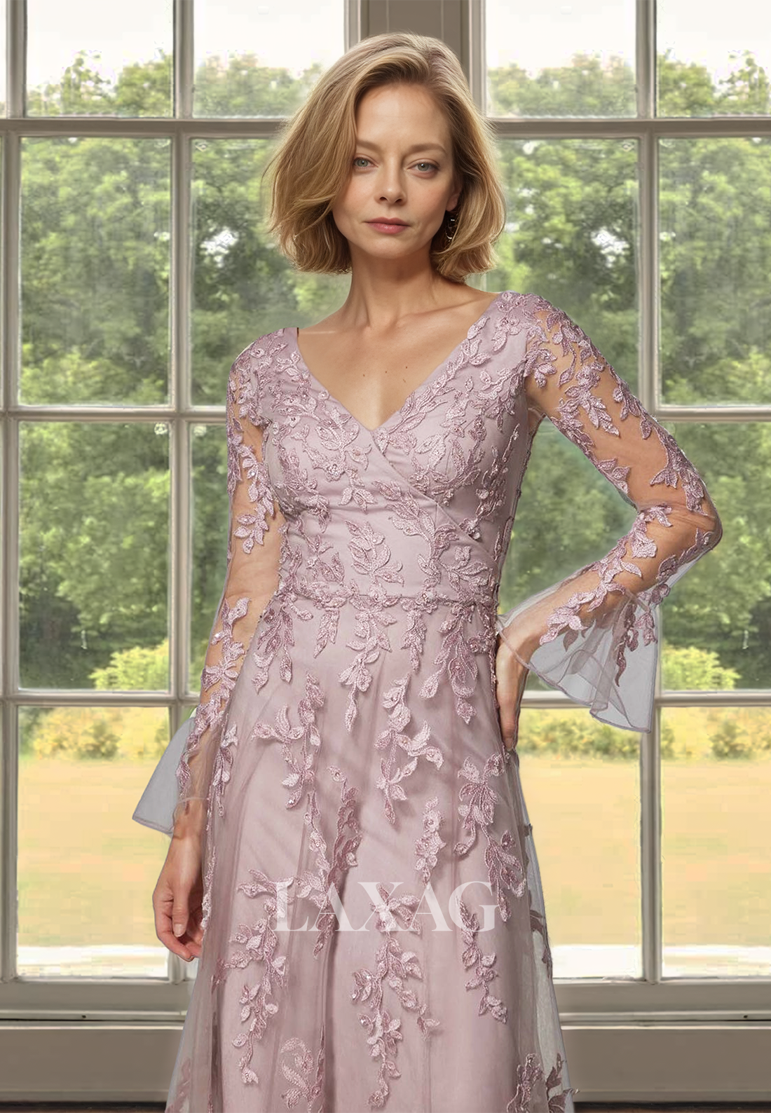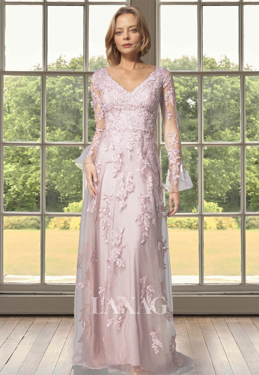 V-Neck Long-Sleeves Fitted Mother of the Bride Dress Allover Lace Applique Sheer Cocktail Gowns