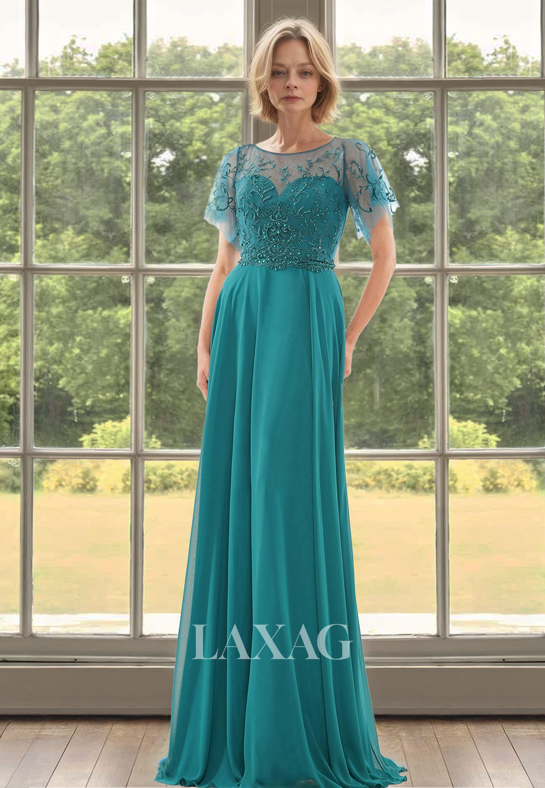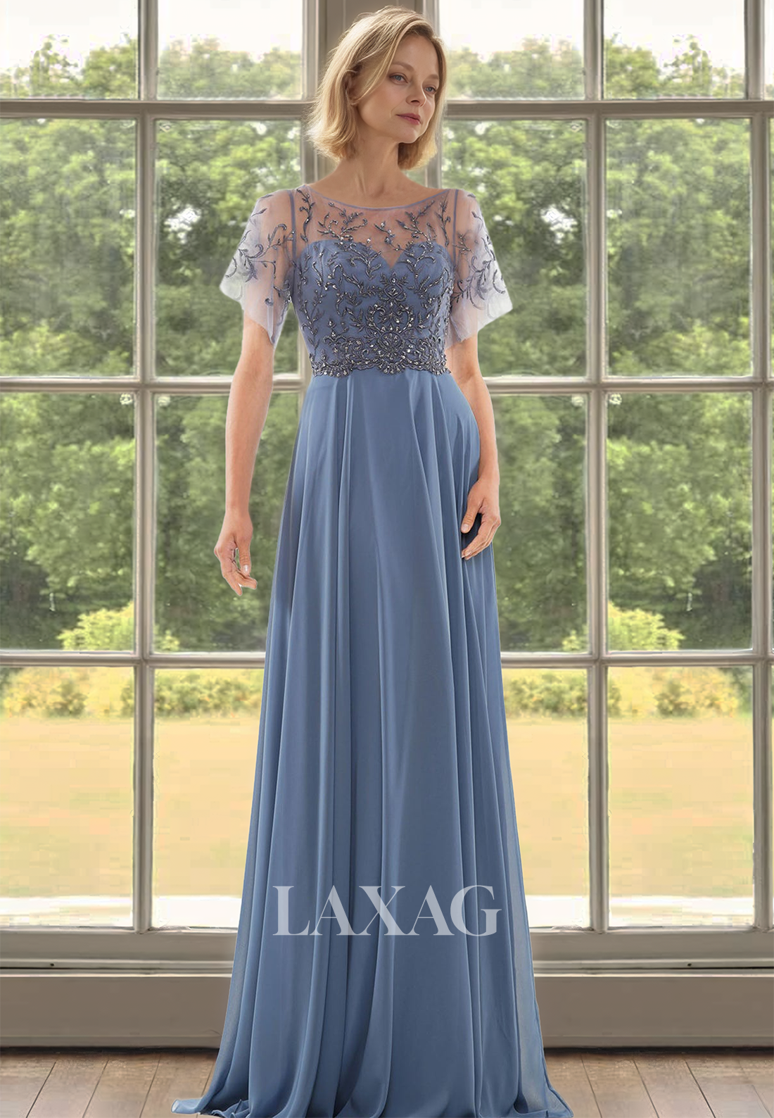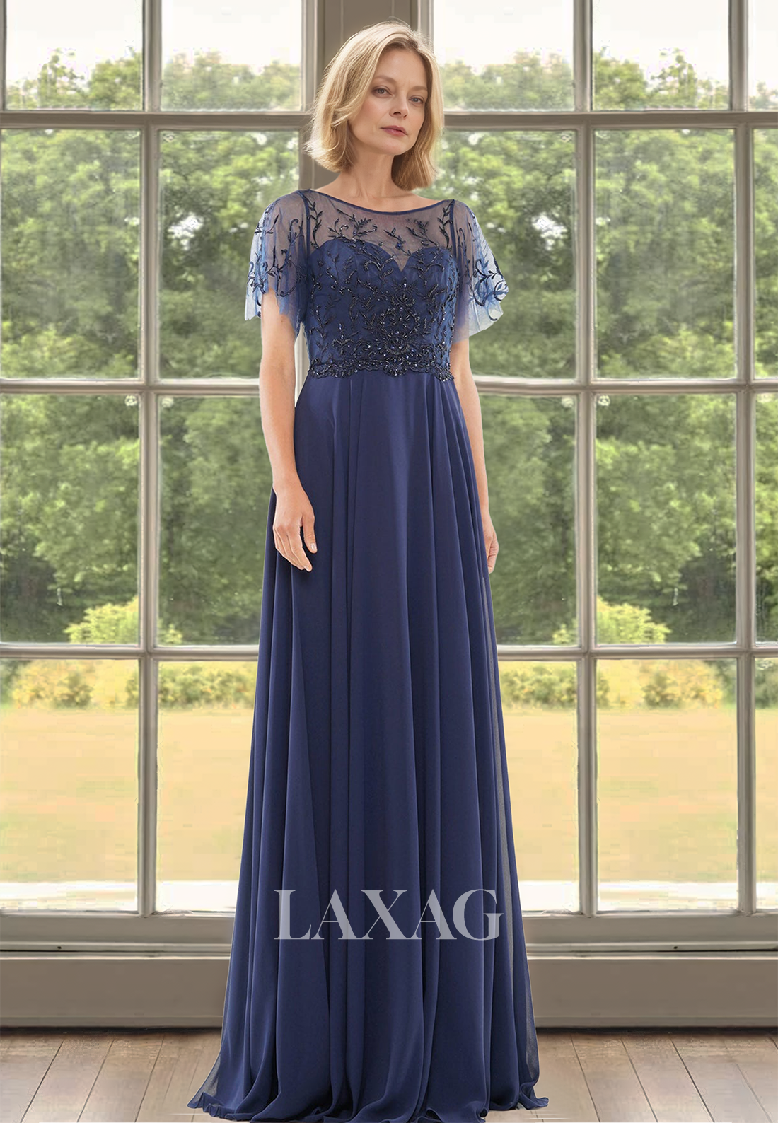 Expertly designed for mothers of the bride, this A-line dress features a flattering scoop-neck and short sleeves for a timeless look. The beaded applique and pleated sheer chiffon add elegant touches to the dress, making it perfect for any formal wedding or event.