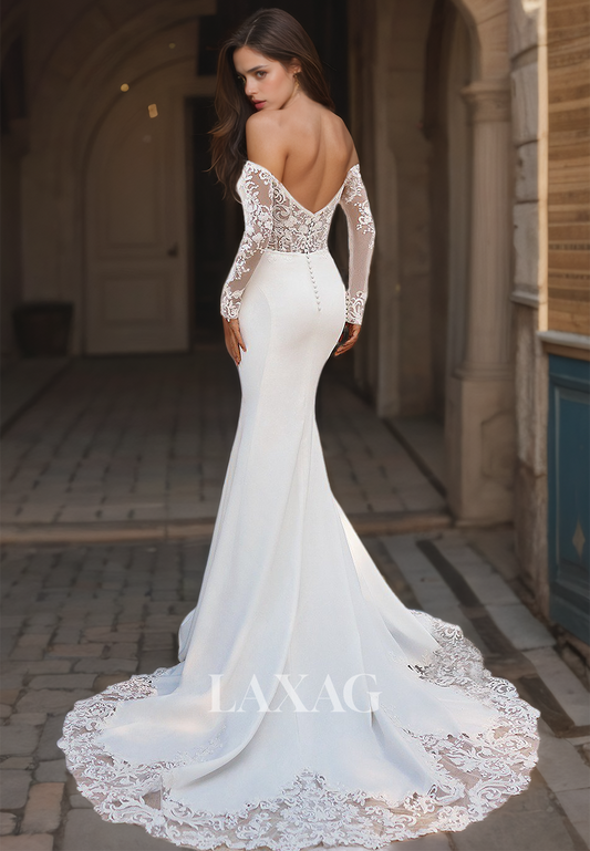 Sweetheart Lace Applique Long Sleeves Bride Dress Off-Shoulder Cutout Mermaid Wedding Dress with Train