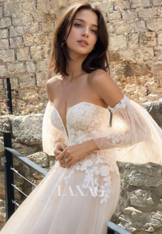 Sweetheart Long Sleeves Wedding Dress with Lace Appliques Sweep Train A-Line Bridal Gowns