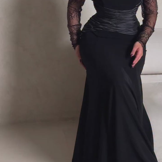 Make a stunning entrance in this sophisticated evening dress that combines timeless elegance with modern glamour. The bateau neckline frames your shoulders beautifully, while delicate lace sleeves add an ethereal touch of romance. Crafted from luxurious pleated satin, the fitted mermaid silhouette hugs your curves before flowing into a dramatic floor-length train that commands attention. Perfect for galas, weddings, and formal celebrations, this dress transforms you into the most captivating guest in the room. Designed to make you feel confident, radiant, and unforgettably beautiful.