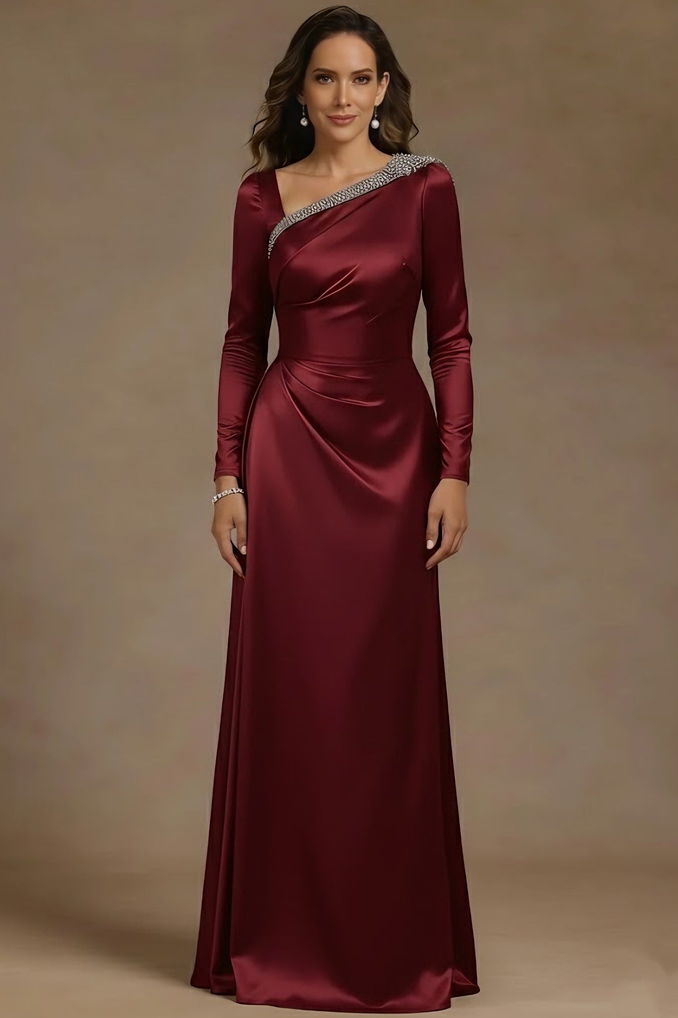 Asymmetrical-Neck Long-Sleeves Beaded Satin Pleated Fitted Mother of the Bride Dress