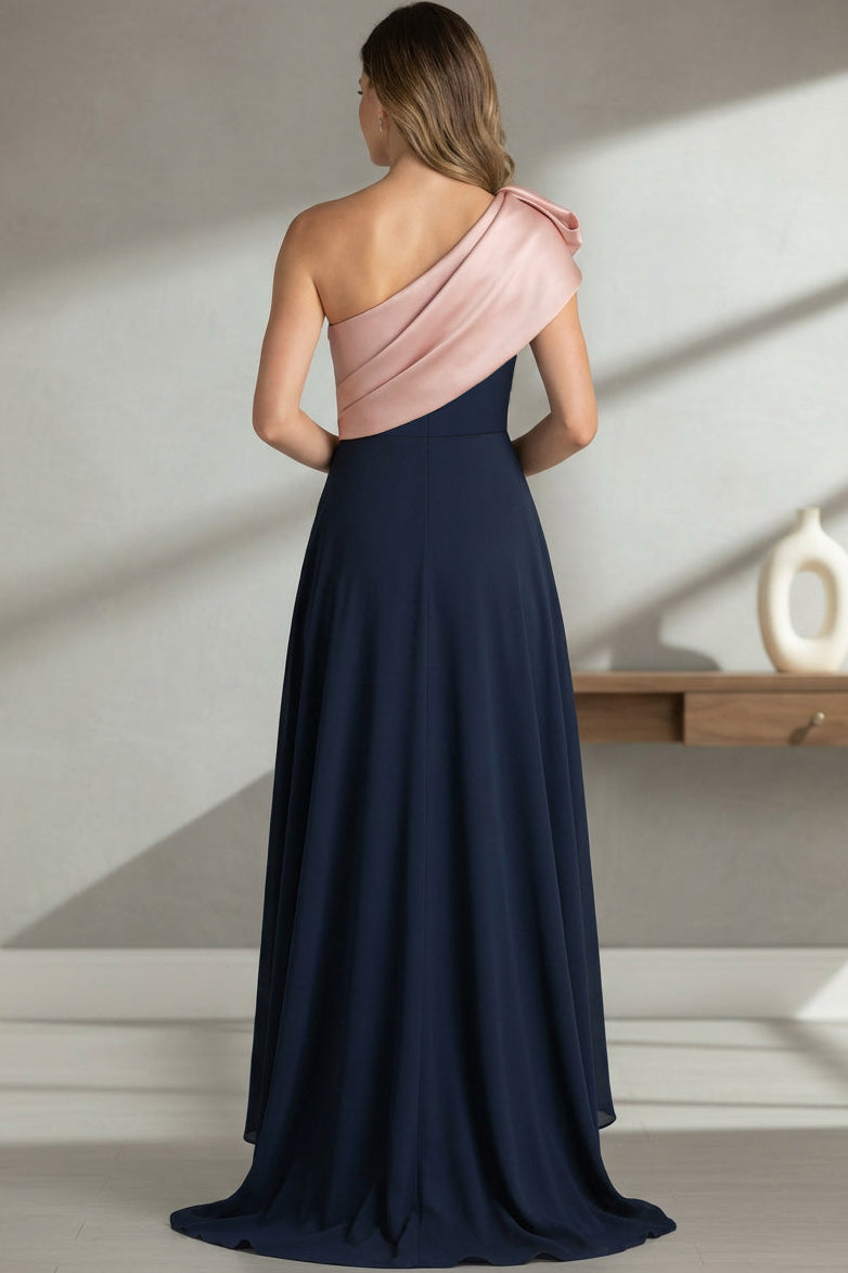 Elevate your special occasion look with this sophisticated Mother of the Bride dress. Featuring an elegant asymmetrical neckline and sleeveless design, this two-tone satin gown combines timeless style with modern flair. The pleated bodice flows into a graceful A-line silhouette that flatters every figure while the luxurious satin fabric drapes beautifully. Perfect for weddings and formal events, this dress strikes the ideal balance between refined elegance and contemporary fashion, ensuring you'll feel confident and stunning beside the bride.