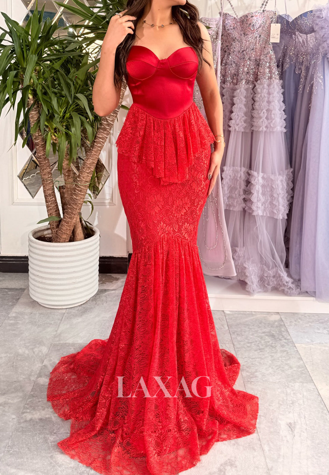 Elevate your prom night with this stunning formal dress featuring a sweetheart neckline and delicate spaghetti straps. The sleeveless silhouette showcases intricate lace detailing paired with luxurious satin fabric, while elegant pleating adds dimension through the bodice. The trumpet mermaid silhouette hugs your curves beautifully before flowing into a graceful sweep train, creating a show-stopping entrance. Perfect for proms, galas, and formal events, this dress combines timeless sophistication with modern elegance for an unforgettable evening.