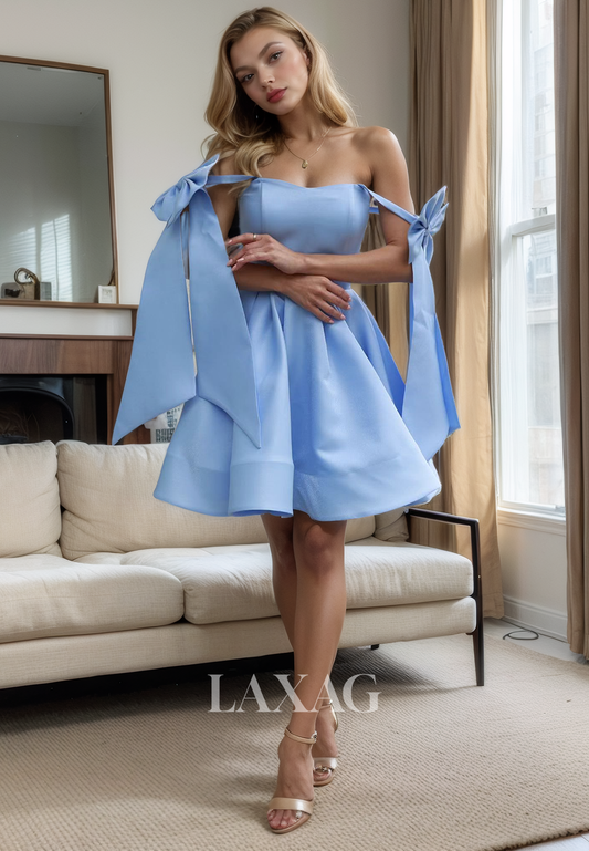 A-Line Off Shoulder Sleek Satin Elegant Party Homecoming Dress with Bow Detail