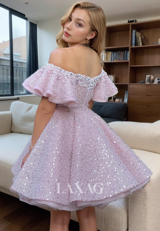 A-Line Off Shoulder Tulle Pearls Sequins Elegant Party Homecoming Dress