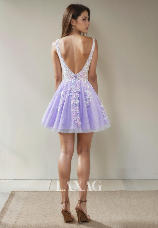 A-Line V-Neck Open Back Tulle Sequins Elegant Party Homecoming Dress