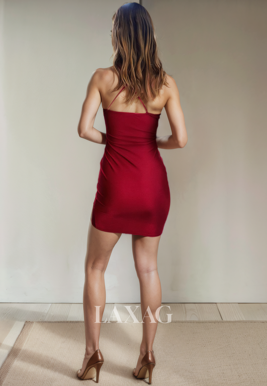 Spaghetti Straps V-Neck Pleated Sleek Satin Fitted Party Homecoming Dress