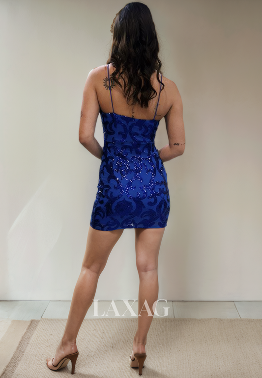 Spaghetti Straps V-Neck Sequins Sleek Satin Fitted Party Homecoming Dress