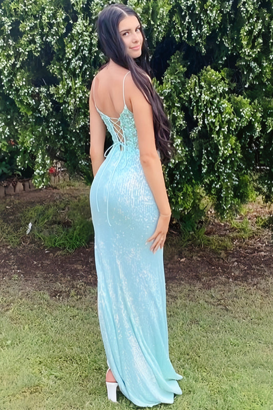 V-Neck Spaghetti Straps Sleeveless Fully Sequined Applique Mermaid Dress with Slit