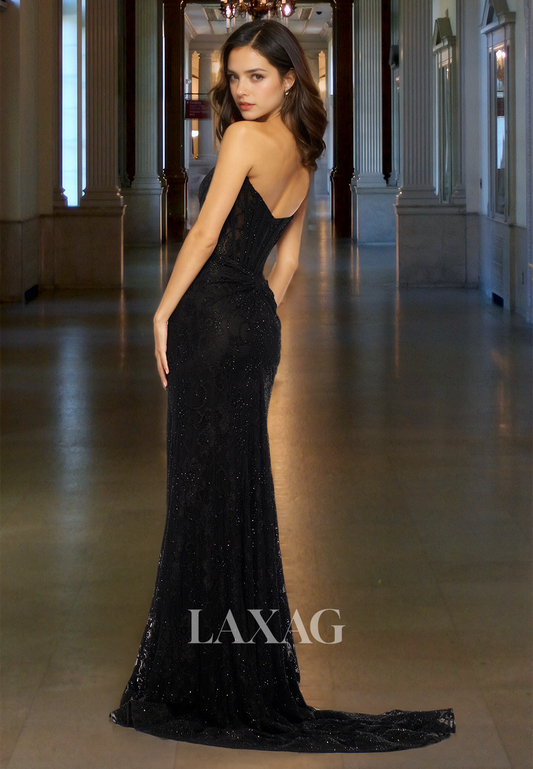 Sweetheart Beaded Glitter-Lace Applique Mermaid Prom Dress Sleeveless Off-Shoulder High Slit Party Gowns