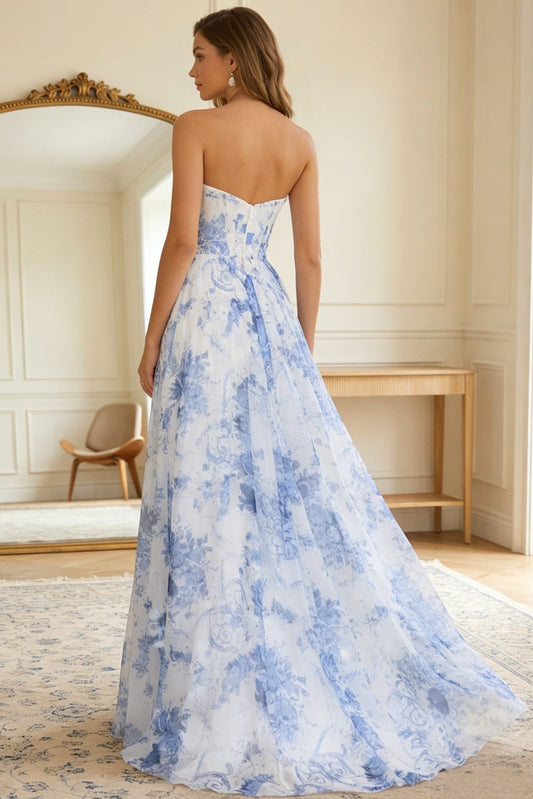 Tube Top Sleeveless Print-Chiffon Pleated Sweep Train A-Line Formal Prom Dress with Slit