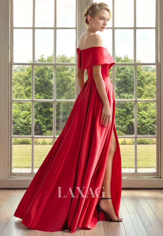 A-Line Off Shoulder Sleek Satin Elegant Mother of the Bride Dress with Slit