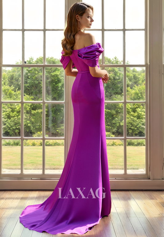 Off Shoulder Pleated Sleek Satin Mother of the Bride Dress with Slit and Train
