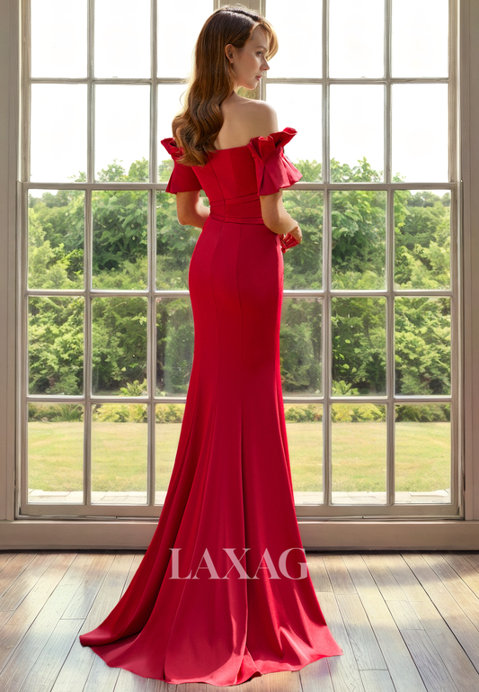 Off Shoulder Pleated Sleek Satin Mermaid Mother of the Bride Dress with Train