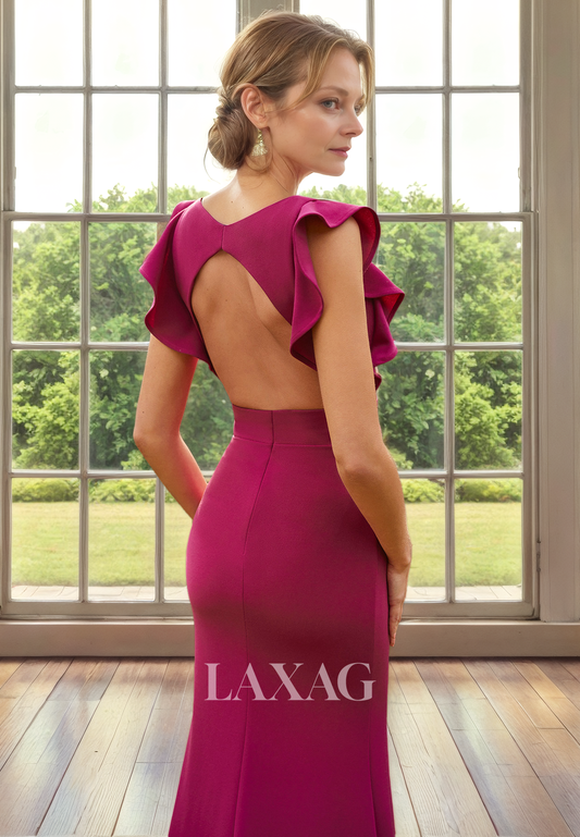 V-Neck Open Back Sleek Satin Mermaid Mother of the Bride Dress with Slit and Train