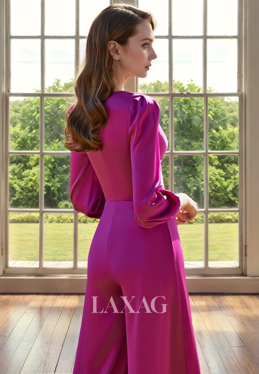 V-Neck Quarter Sleeves Cutout PantSuit Sleek Satin Mother Of the Bride Dress
