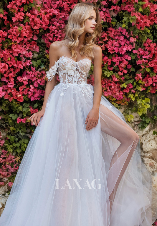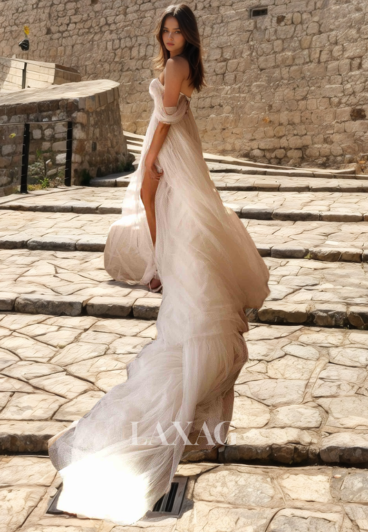 Off Shoulder Sweetheart Tulle illsuion High Slit Elegant Wedding Dress with Train