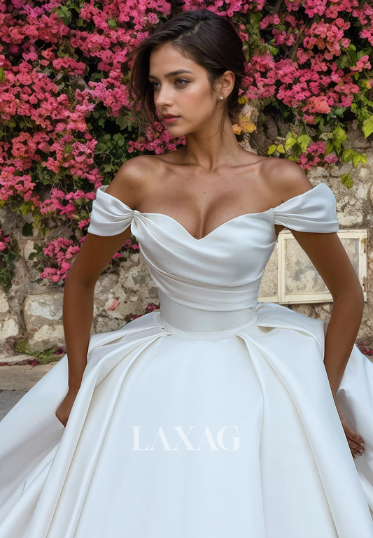 A-Line Off Shoulder Pleated Sleek Satin Elegant Wedding Dress with Train