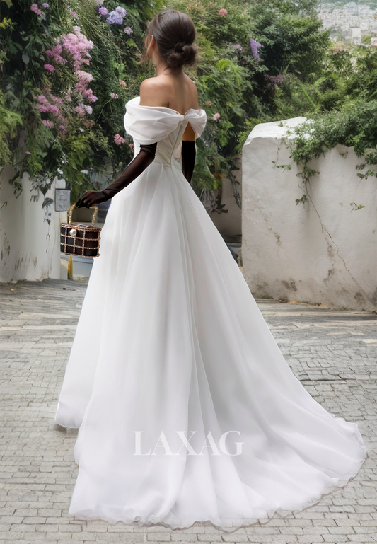 A-Line Off Shoulder Sleek Satin Elegant Wedding Dress with Slit and Train