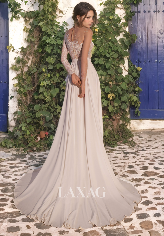 A-Line Long Sleeves V-Neck Chiffon Elegant Wedding Dress with Slit and Train