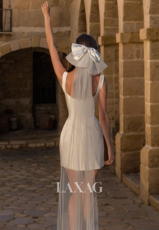A-Line Square-Neck Satin Short Wedding Dress Spaghetti Straps Pleated Boho Beach Bride Gowns