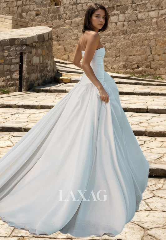 A-Line Strapless Pleated Sleek Satin Elegant Wedding Dress with Train