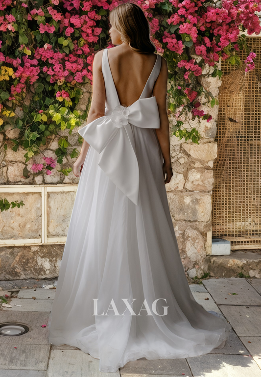 A-Line V-Neck Backless Sleek Satin Elegant Wedding Dress with Train