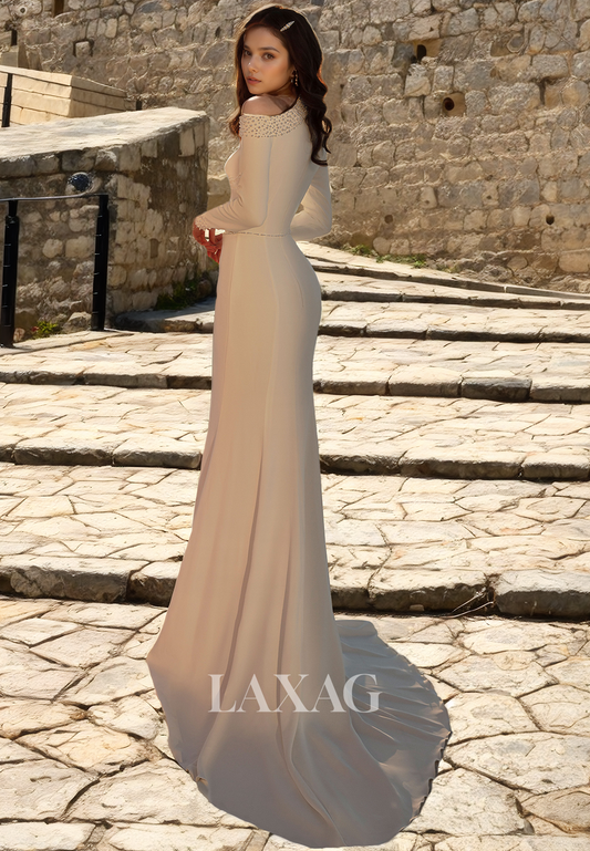 A-Line Long Sleeves Beaded Tulle Elegant Mermaid Wedding Dress with Train